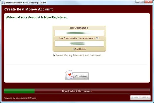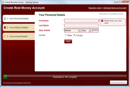 The Grand Mondial Casino software will now start to install. While the software downloads, you can register a real account or opt to use an existing account if you already have one.